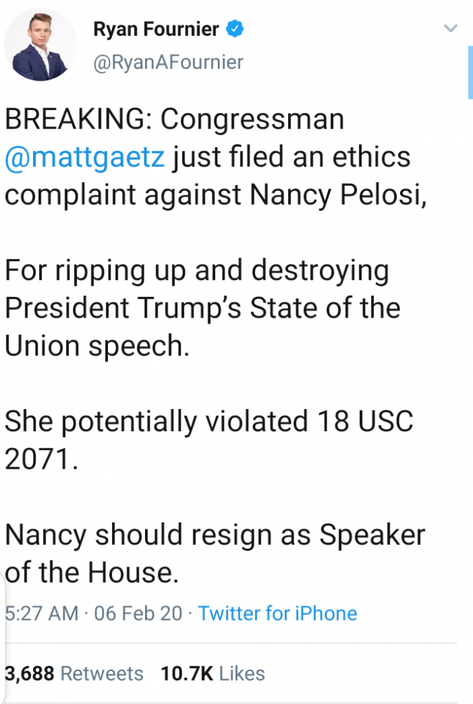 Florida congressman, Matt Gaetz has filed an ethics complaint against House Speaker Nancy Pelosi for tearing up her own copy of President Trump’s speech during the State of the Union address on Tuesday, saying she broke the law.