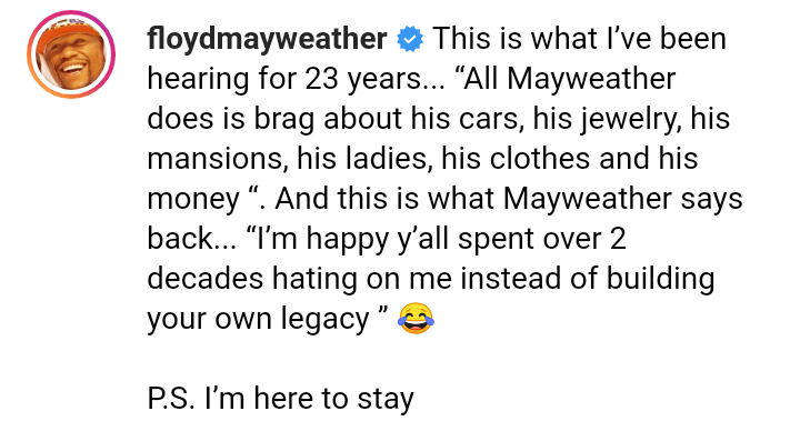 This is what I’ve been hearing for 23 years… “All Mayweather does is brag about his cars, his jewelry, his mansions, his ladies, his clothes and his money “. And this is what Mayweather says back… “I’m happy y’all spent over 2 decades hating on me instead of building your own legacy ”