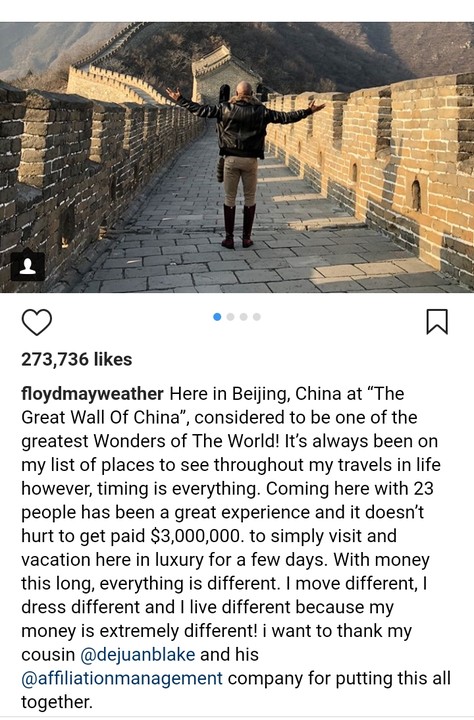 Undefeated famous boxer, Floyd Mayweather who is currently on vacation with 23 people in Beijing, China said he was being paid $3million for the visit.