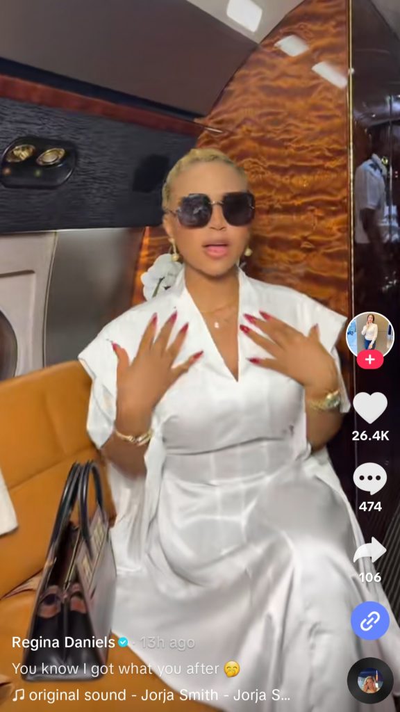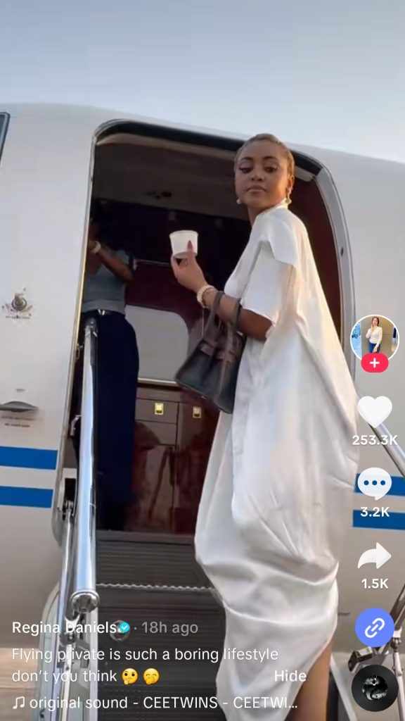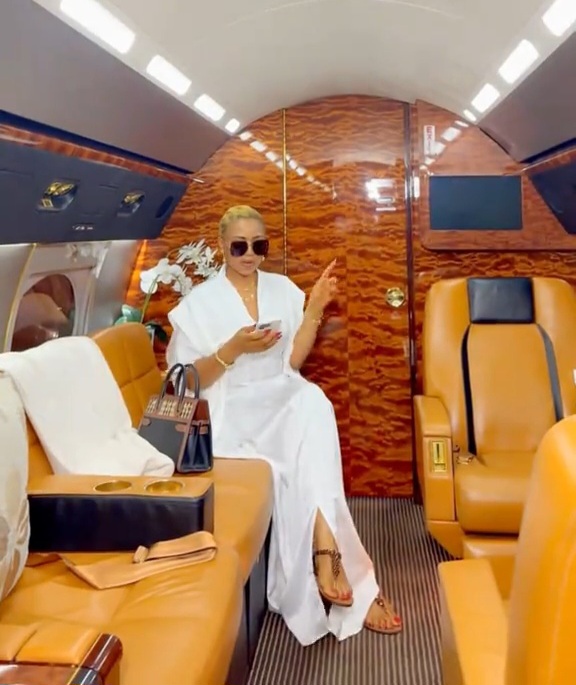 She showed herself boarding a private jet and later being welcomed by her husband, Ned Nwoko.