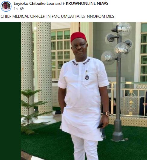 Dr Udo Orji Nnorom, the Chief Medical Officer (CMO) of the Federal Medical Centre (FMC), Umuahia, Abia State, has been reported dead.