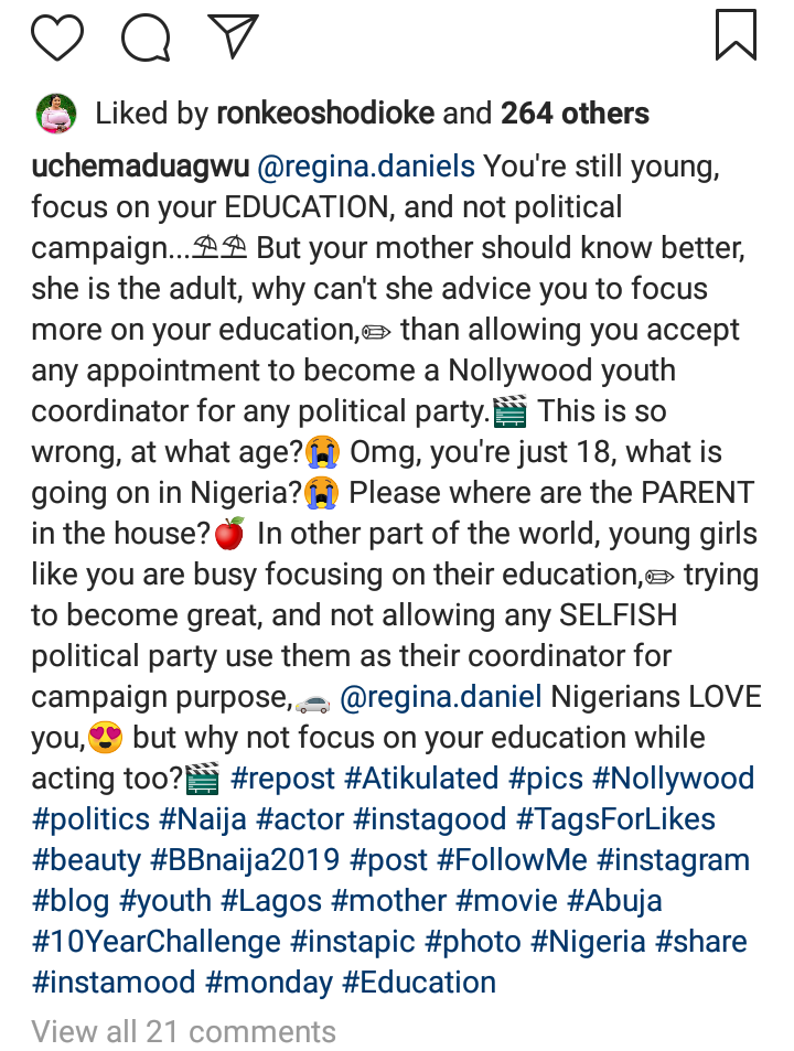“Focus On Your Education” Uche Maduagwu Blast Regina Daniels for accepting Political Party Appointment.