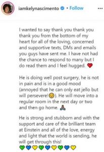 ‘He is doing well post-surgery, he is not in pain and is in a good mood (annoyed that he can only eat jello but will persevere!). He will move into a regular room in the next day or two and then go home,’ Nascimento said on Instagram.