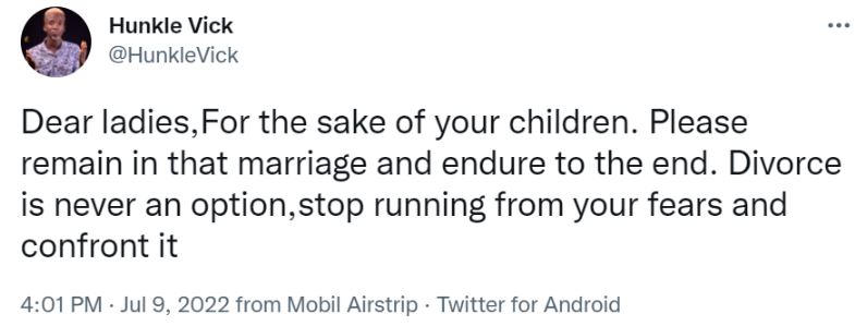 @hunklevick in his tweet, advised women to endure till the end as divorce is “never an option.”