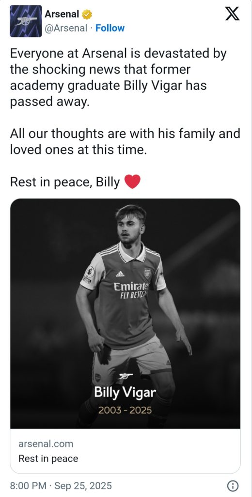 “Everyone at Arsenal Football Club is deeply sorry to hear of the tragic passing of Chichester City forward and former Arsenal academy player, Billy Vigar,” a statement from Arsenal read.