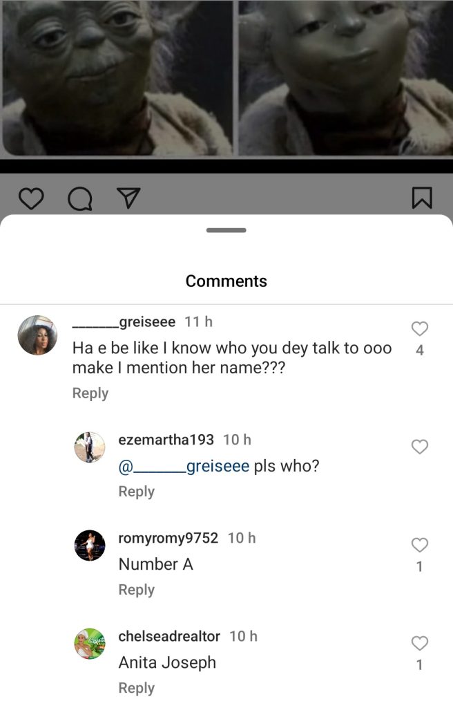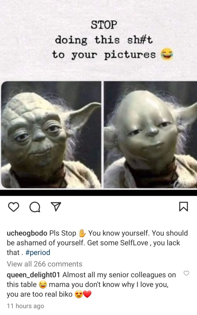 Uche then took to her page to share side-by-side photos of the Star Wars character Baby Yoda with a rough face and another airbrushed image to give Baby Yoda a smooth face.