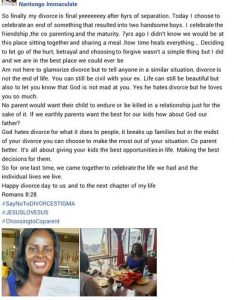 “God hates divorce for what it does to people, it breaks up families but in the midst of your divorce you can choose to make the most out of your situation. Co parent better. It’s all about giving your kids the best opportunities in life. Making the best decisions for them