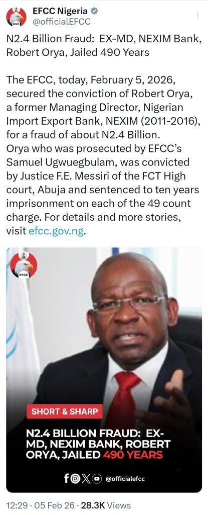 The statement reads, “The EFCC, today, February 5, 2026, secured the conviction of Robert Orya, a former Managing Director, Nigerian Import Export Bank, NEXIM (2011-2016), for a fraud of about N2.4 billion.