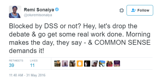 Remi Sonaiya was the candidate for KOWA party in the 2015 Presidential election. Her tweet was in response to Senator Bruce’s claim that DSS officials prevented him from greeting President Buhari at the Dinner held yesterday to host NASS members at the Presidential Villa, Abuja.