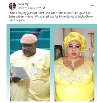 Late Eke who represented Etche/Omuma Federal Constituency in the House of Representatives between 2015 and 2019, died last Friday, January 15, ten days after his wife passed away on January 5. The cause of their deaths is yet to be disclosed by members of his family.
