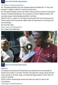 “The Deputy Commissioner Of Police,SCID just ordered the Area Commander Of Omoku Area Division To Produce The Man that raped this 14years old girl and the entire case file to the SCID today. All Parties Will Appear Before The DC SCID On Friday For Briefing. RIVCSO will be monitoring the events and make sure justice is done in the circumstance.” the statement read.