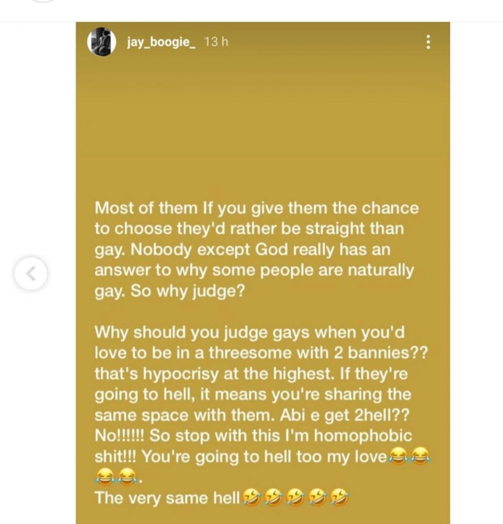 Jay Boogie stated that nobody except God can give an answer as to why some people are gay and he advised people to stop being homophobic.
