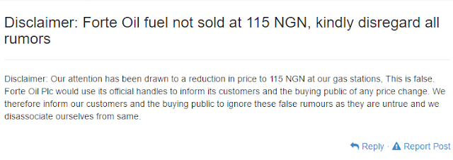 As soon as she shared it, the rumour started trending as Nigerians were obviously interested in purchasing fuel for a lesser price than what is currently being sold. Forte Oil Plc has however responded and debunked it as false…