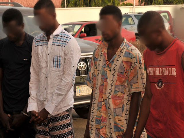 The paraded suspects included Chikezie MacDonald (a.k.a Walking Dutch), 22; Chidozie Obi (a.k.a Small Boy), 21; Chukwuemeka Awom (a.k.a Archangel), 25; and Chigozie Francis Eberendu (a.k.a Star Boy), 23.
