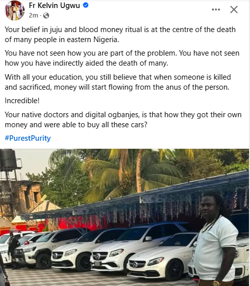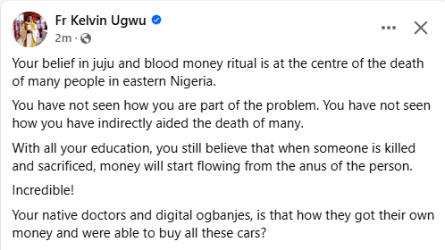 The missionary priest who stated this in a Facebook post on Friday, also called out self-styled native doctors and digital ogbanges (Ezenwanyis)