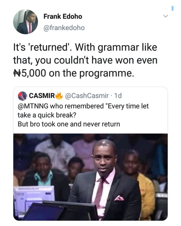 A follower tried to be savage on Twitter by tweeting about Frank Edoho’s exit from Who Wants to be a Millionaire. But Frank hit back at him with a savage tweet of his own.