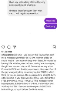 He shared a message he received from a follower begging for prayers after he stopped having an erection following a sexual encounter with a lady he had only known for 48 hours.