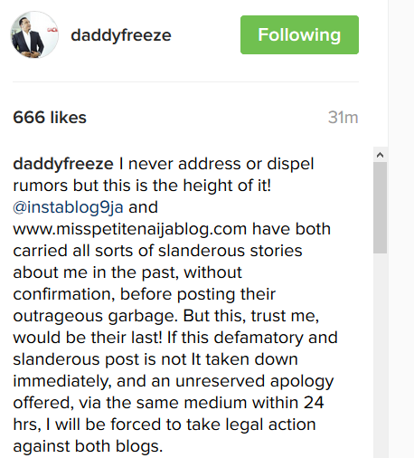 Freeze in his reaction doesn’t deny that but he says his issues with CoolFM have nothing to do with Basketmouth’s wife. Read what he just wrote on his IG page below:
