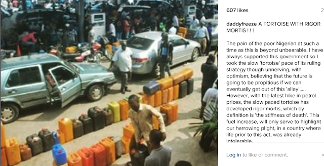 Freeze took to his IG page to weigh in on the increased petrol price by the Federal Government.