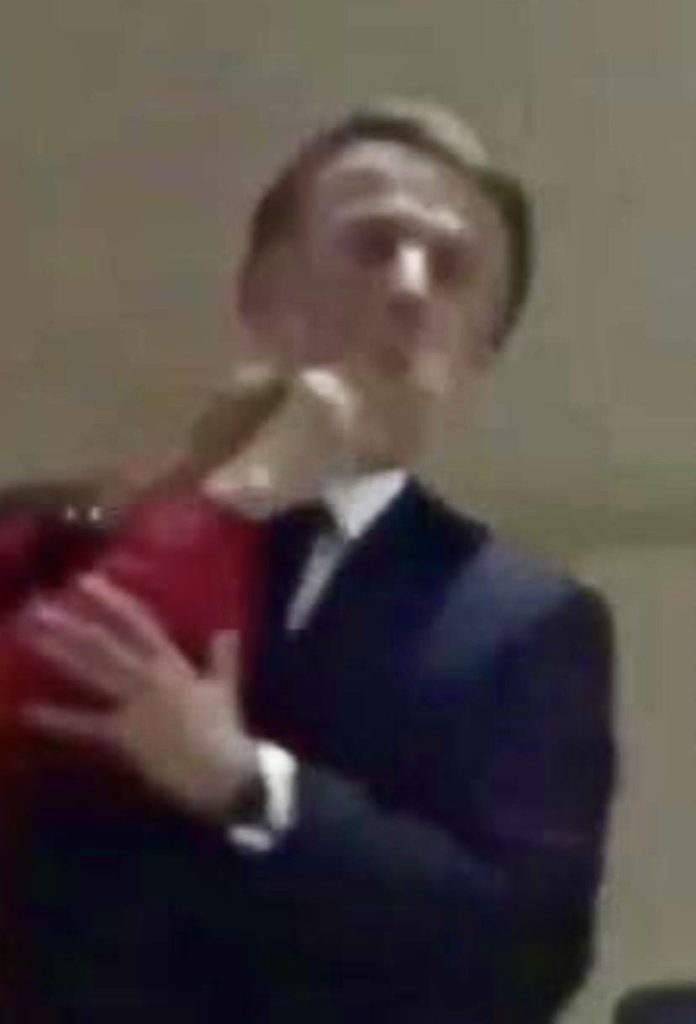 Suddenly, his wife Brigitte’s hands reached out and appeared to smack the French president’s mouth.