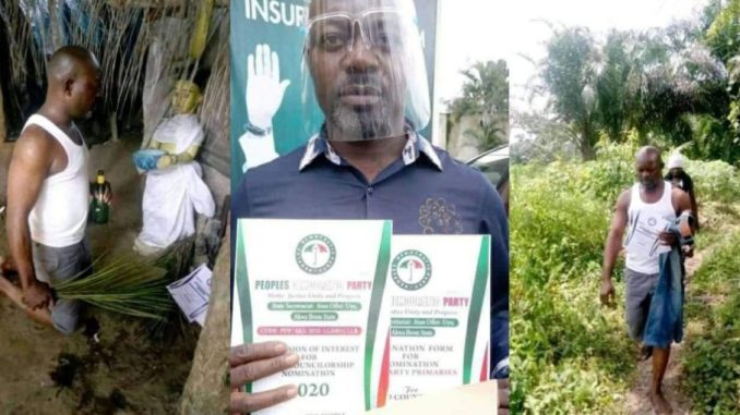 A Councillorship Aspirant for the upcoming 2020 Local Government Elections in Akwa Ibom State, Friday Etim Ukim, has taken to the shrine his nomination/interest forms.