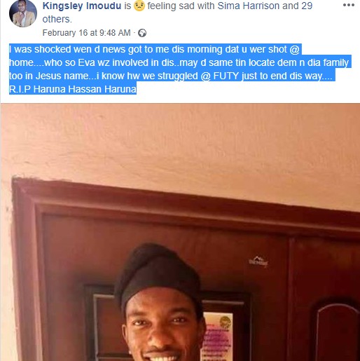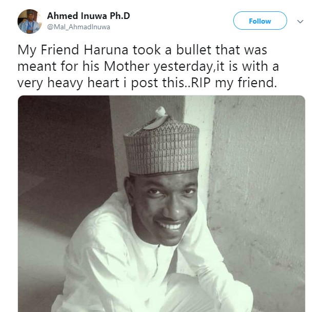 Friends are currently mourning a young Engineer identified as Haruna Hassan, who took a bullet meant for his mum in Gombe State.