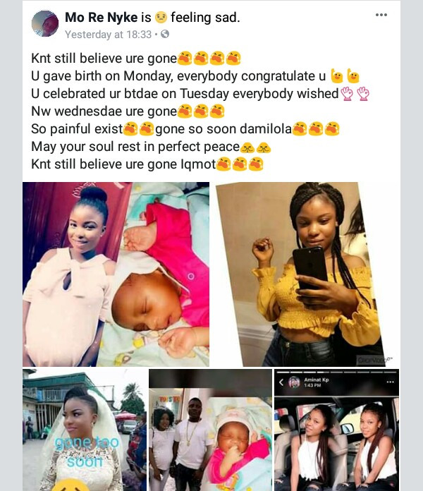 A University of Ilorin graduate, Damilola Quadri has passed away after giving birth to her first child. The young lady gave birth on Monday, February 4th, celebrated her birthday on Tuesday, 5, and died on Wednesday, February 6. A friend of late Damilola took to Facebook to mourn her death. She wrote: “Knt still believe ure goneU gave birth on Monday, everybody congratulate uU celebrated ur btdae on Tuesday everybody wishedNw wednesdae ure goneSo painful exist gone so soon damilola May your soul rest in perfect peaceKnt still believe ure gone Iqmot”