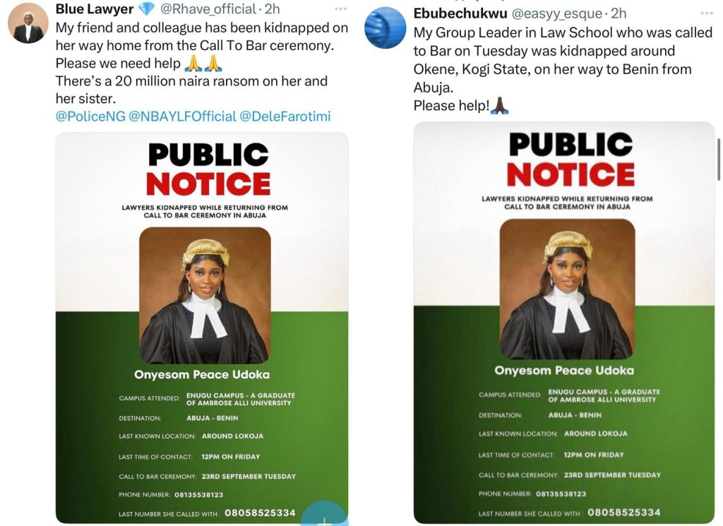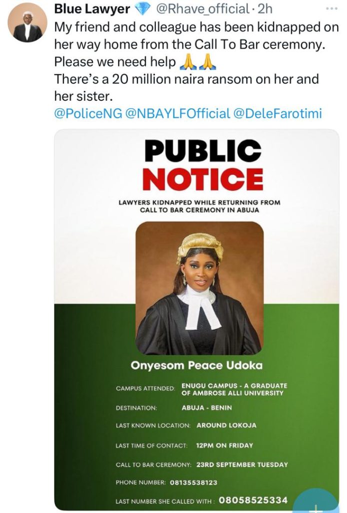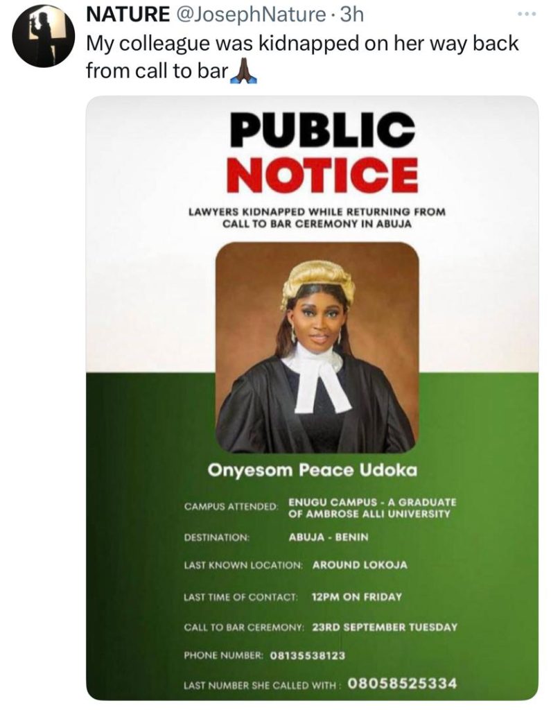 According to multiple posts shared online, her friends claim that Onyesom who recently became a lawyer, attended her call to bar ceremony in Abuja on Tuesday, September 23. They said she was on her way back to Benin city, Edo state when she was abducted alongside her sister.