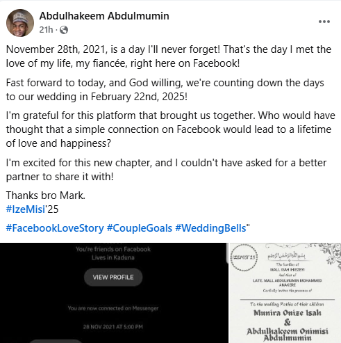 A Nigerian man, Abdulhakeem Onimisi Abdulmumin, has narrated how he and his fiancée’s love story began on Facebook three years ago.