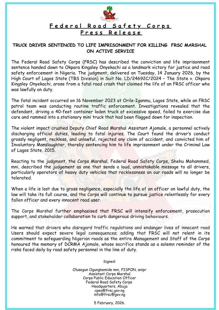 The Federal Road Safety Corps (FRSC) has described the conviction and life imprisonment of a truck driver , Okpara Onyekachi as a landmark victory for justice and road safety enforcement in Nigeria.