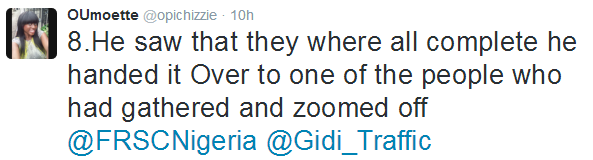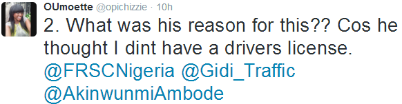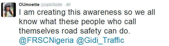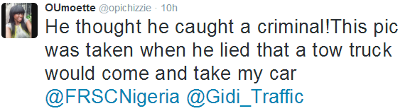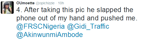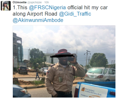Twitter user, @opichizzie, has accused the FRSC official pictured above, of assaulting her while she was driving along Airport road, Lagos. According to her, the official thought she did not have a valid drivers license and attacked her even before asking for it. Continue to read what she narrated on twitter after the cut.