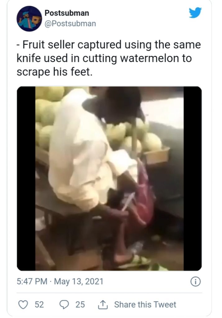 In the video shared online, the fruit seller did not notice that someone was recording him, as he uses the same knife he used for selling watermelon to scrape his feet.