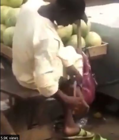 A shocking video has surfaced online showing the moment a watermelon seller was using the knife he uses to cut his fruits to scrape his sole.