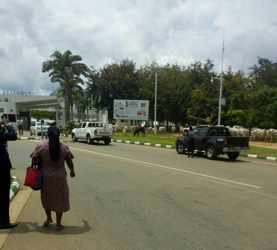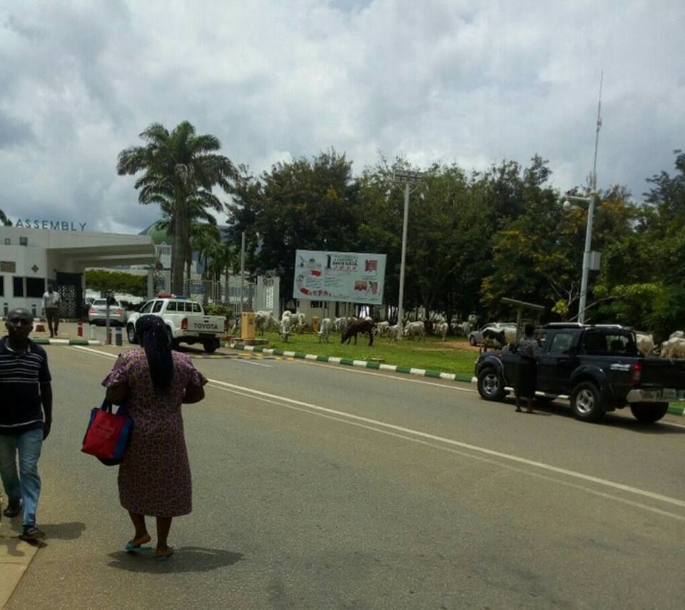 A Facebook user has berated the authorities after some cows were seen loitering in front of the National Assembly complex in Abuja. According to him, the cows were seen openly grazing on the grass in front of the high secured complex as the security agents there reportedly did little or nothing to chase them away considering the location of the federal office.
