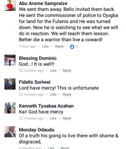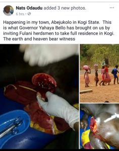 According to multiple online reports,Fulani herdsmen attacked Abejukolo in Omala LGA of Kogi state.Three people were wounded during the attack.The villagers said that Governor Bello’s plan of making herdsmen take full control of Kogi is coming is abput materialising.