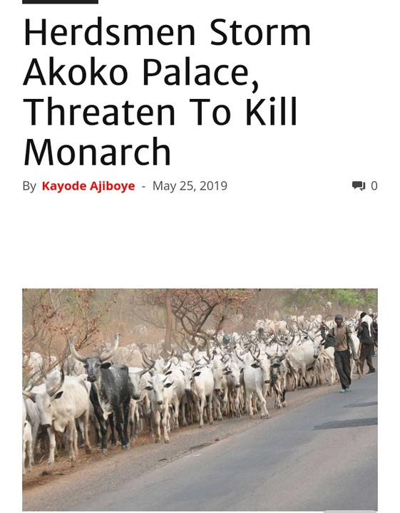 Suspected Fulani herdsmen, numbering at least nine, have attacked the palace of Onigedegede of Gedegede in Akoko North-West Local Government Area of Ondo State, threatening to kill the monarch, Oba Walidu Sanni.
