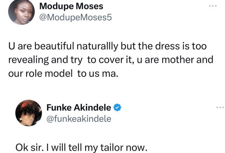 According to the Twitter user identified as Modupe Moses, Funke is a mother and a role model and should not be wearing such outfit.