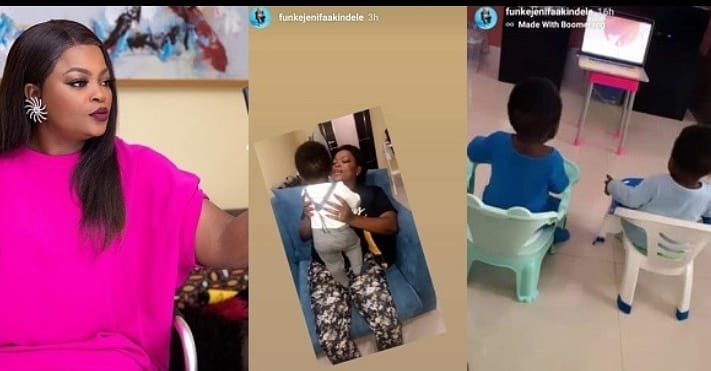 Nollywood actress Funke Akindele who has refused to show her twins face show them off recently and it seems the boys are growing so fast.