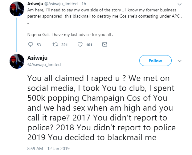 YOU ALL CLAIMED I RAPED U ? WE MET ON SOCIAL MEDIA, I TOOK YOU TO CLUB, I SPENT 500K POPPING CHAMPAIGN COS OF YOU AND WE HAD SEX WHEN AM HIGH AND YOU CALL IT RAPE? 2017 YOU DIDN’T REPORT TO POLICE? 2018 YOU DIDN’T REPORT TO POLICE 2019 YOU DECIDED TO BLACKMAIL ME