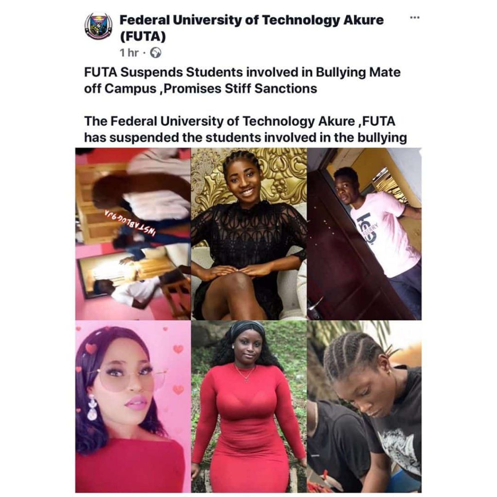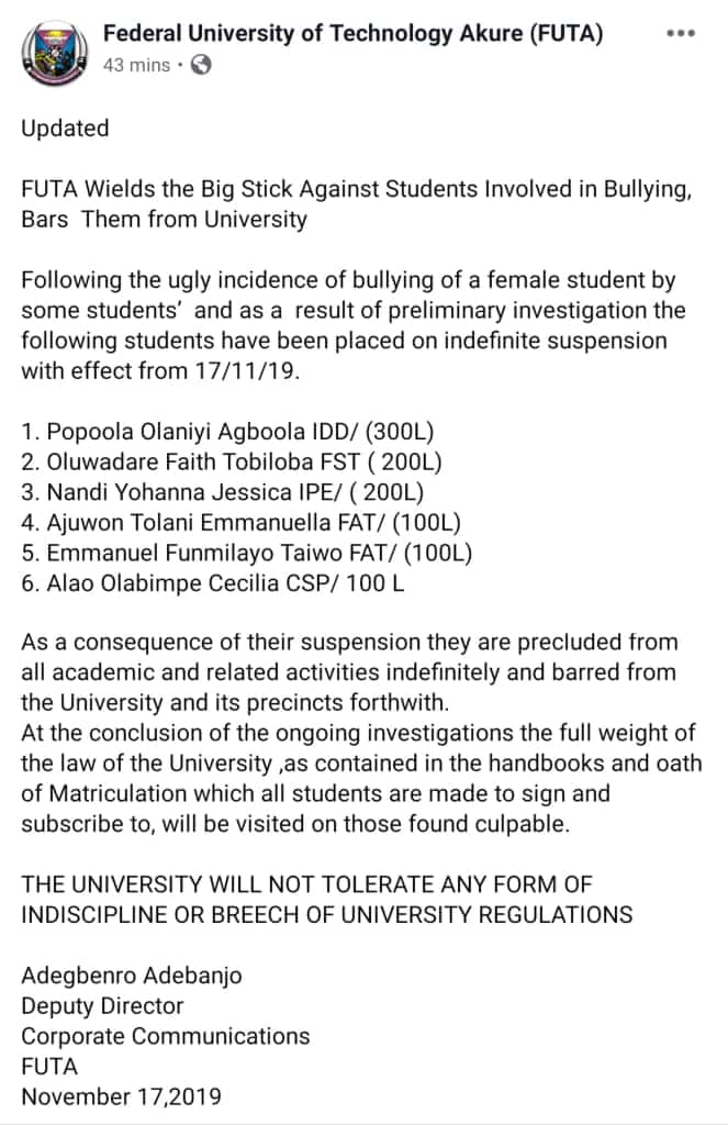 The Federal University of Technology Akure ,FUTA has suspended the students involved in the bullying of a female student in one of the off campus hostels on Saturday November 16,2019 indefinitely from all academic and related activities even as it continues with investigations into the circumstances that led to the odious and unfortunate act.