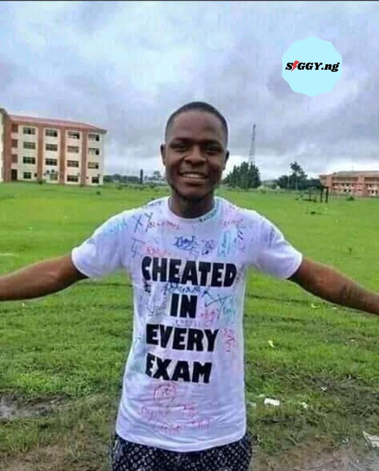 Amidst all these drama, another photo surfaces online of a young male graduate of a yet to be identified University boldly showing this sign-out shirt which read, “Cheated in every Exam”.