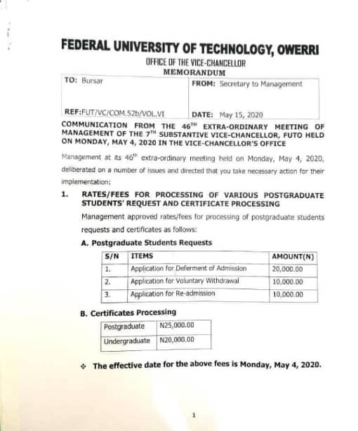 The Federal University of Technology Owerri (FUTO) Vc approves 20,000 naira for collection of undergraduate certifiicate.