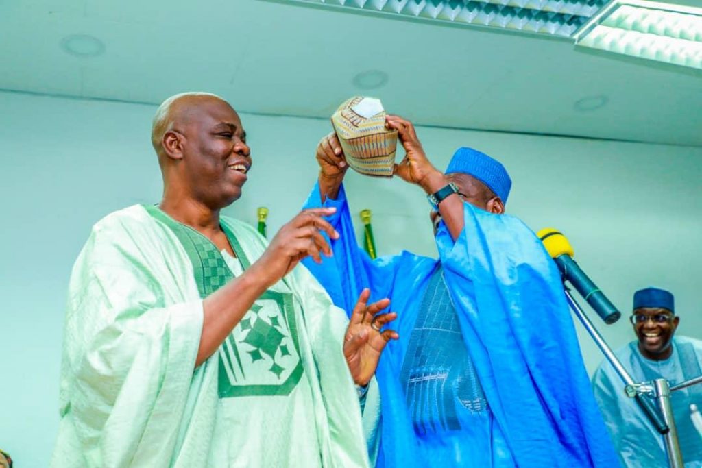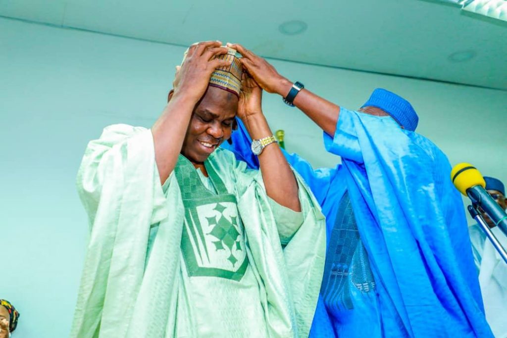 Gov. Abdullahi Ganduje decorating Rabiu Bichi with a new cap, after dropping the red cap symbol of Kwankwasiyya at the Government House on Tuesday.