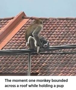 Clips showed the monkey “hugging the puppy tightly” and escaping people trying to rescue it by leaping high onto a roof.