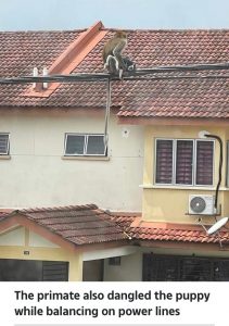 The wild monkey took the pooch to the top of an electricity post in Taman Lestari Putra, Malaysia, on September 16, before leaping from roof-to-roof with it.