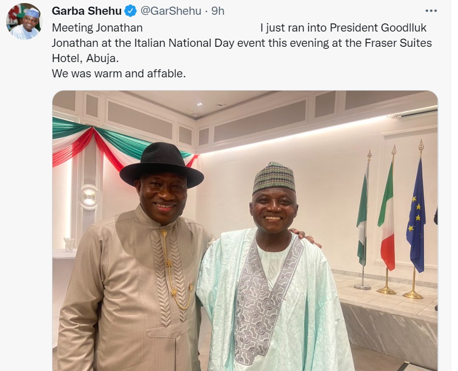 “I just ran into President Goodlluk Jonathan at the Italian National Day event this evening at the Fraser Suites Hotel, Abuja. He was warm and affable.”