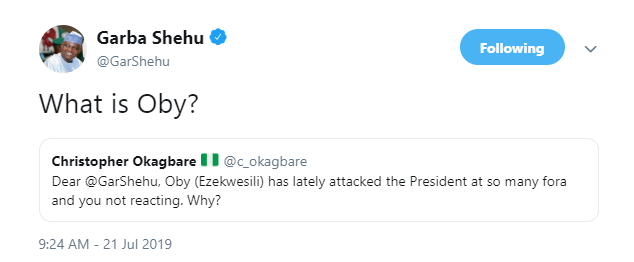Reacting to Oby Ezekwesili’s statements, a Twitter user had asked the Presidential spokesperson why he’s been silent about. However in response to the question, Garba Shehu mocked the former Presidential candidate in the 2019 general election by asking “what is Oby”.