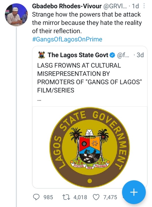 Labour Party’s governorship candidate in Lagos State, Gbadebo Rhodes-Vivour has reacted to Lagos State government’s criticsm on the “Gangs of Lagos” film/series, IGBERETV reports.