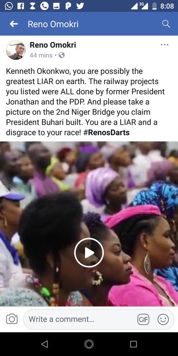 “Kenneth Okonkwo, you are possibly the greatest LIAR on earth. The railway projects you listed were ALL done by former President Jonathan and the PDP. And please take a picture on the 2nd Niger Bridge you claim President Buhari built. You are a LIAR and a disgrace to your race”