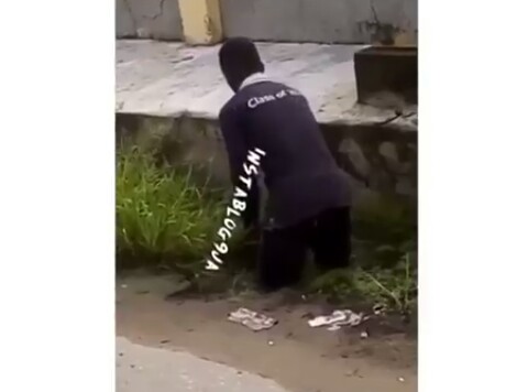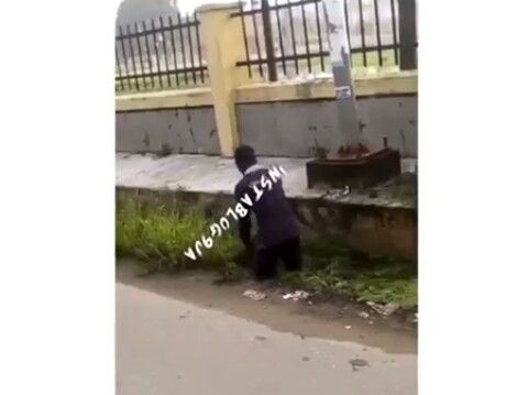 Thief ordered to clear all the weed in a gutter after being caught in Surulere, Lagos State.